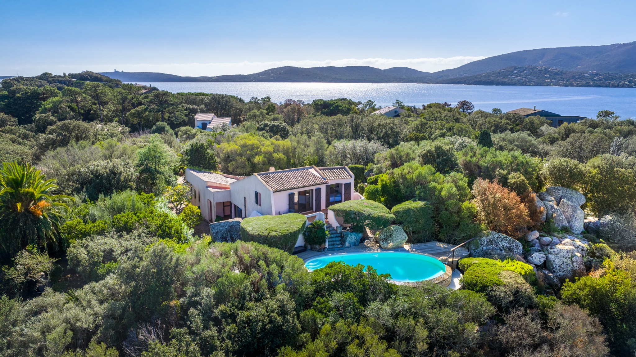 L'espace piscine, harmonieusement inséré dans les rochers et la végétation, permet de profiter d'une agréable vue mer et d'un très beau panorama sur les montagnes.
