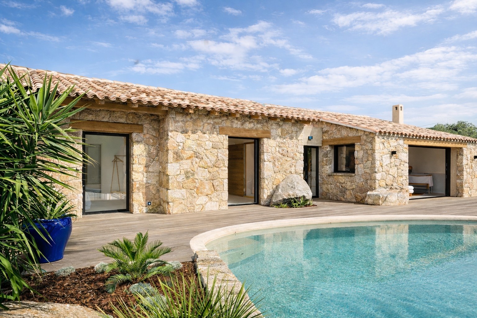 À l'extérieur, le terrain paysager est un véritable écrin naturel, sublimé par un enrochement typique, des oliviers et des murs en pierres sèches. La piscine aux lignes douces, inspirée des lagons, bordée d'une élégante terrasse en Ipé, invite à la détente dans un cadre harmonieux et intimiste.